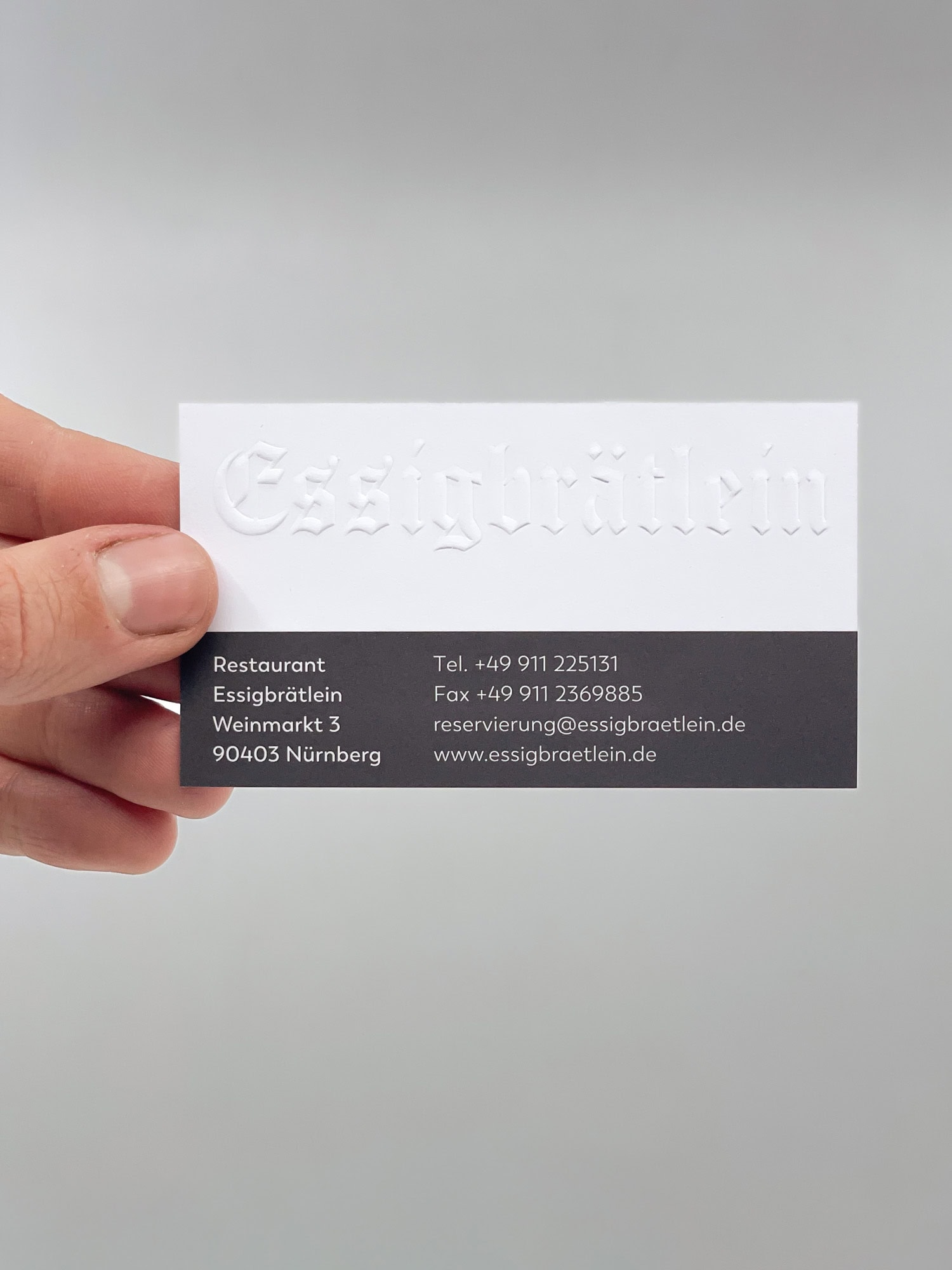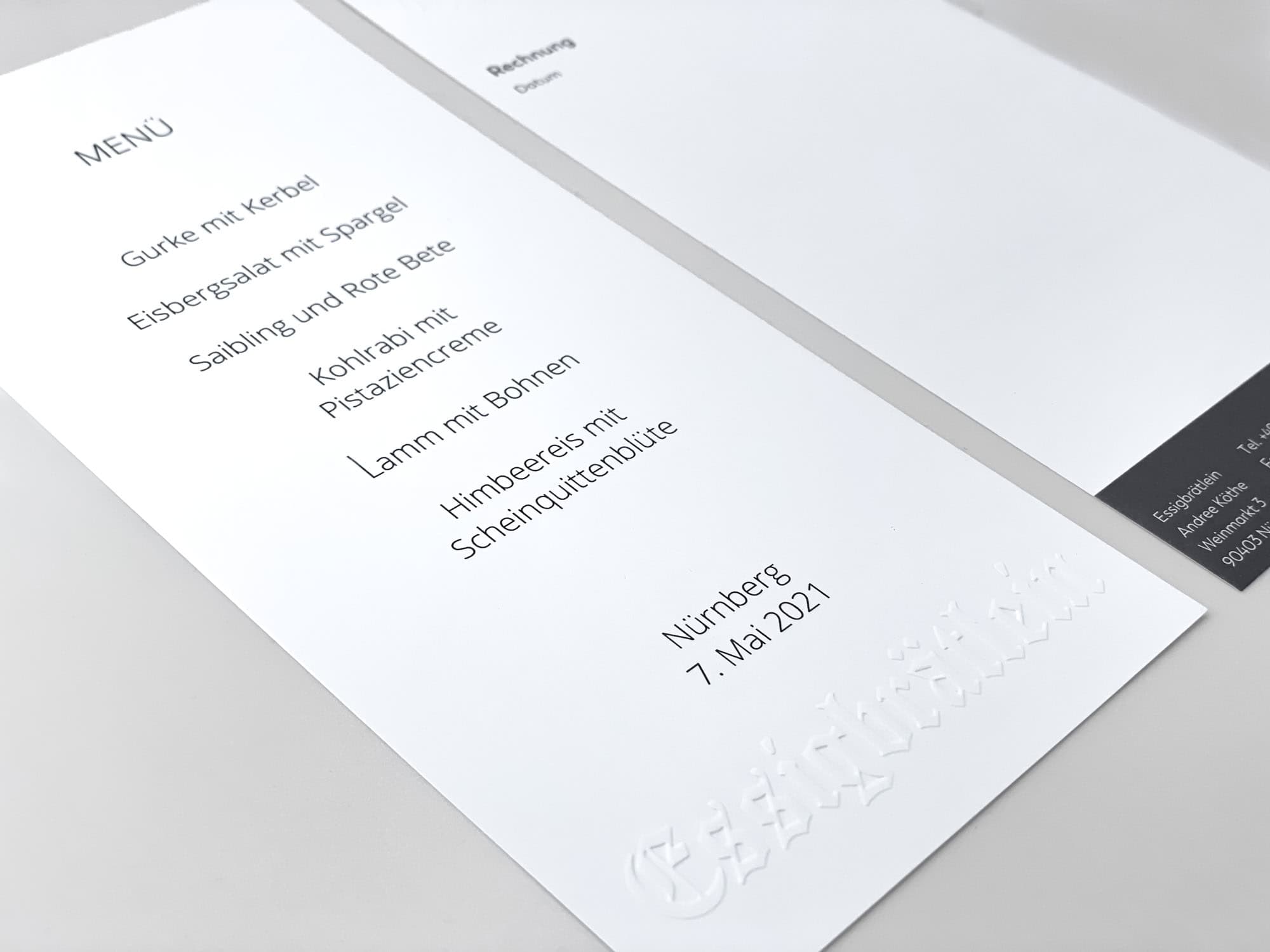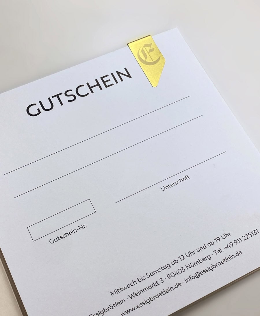 Die neue Geschäftsausstattung wurde auf feinstem Gmund-Papier realisiert – mit einer erhabenen Prägung, die beim Berühren fast an die sinnliche Erfahrung erinnert, die auch ein perfektes Gericht dort für den Gaumen zaubert. Reduktion, Haptik und Qualität bilden hier eine Einheit – genau wie in der Küche des Essigbrätleins.